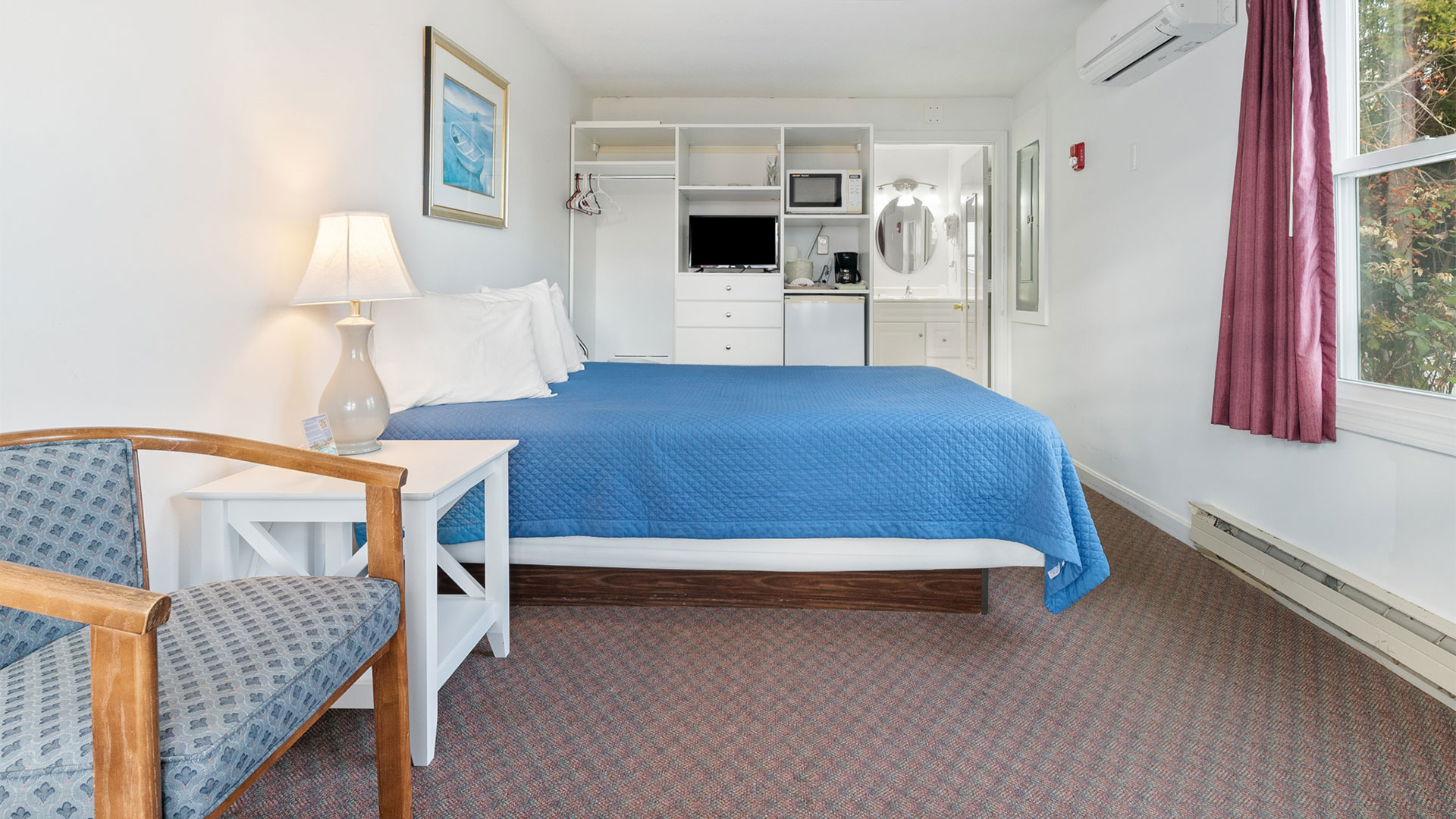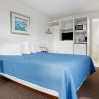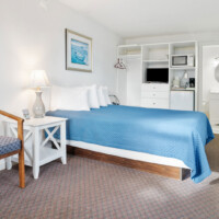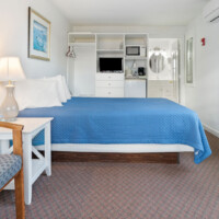Room 10 at The Carriage House Motel, Cottages & Suites is your roomy, fuss-free coastal base—freshly updated, on the ground level, and just steps from easy parking. Inside, a plush king bed anchors the space, with a sleep sofa ready for extra guests. A compact kitchenette—complete with refrigerator, sink, two-burner cooktop, and a café-style table for two—makes simple breakfasts and quick beach-day lunches a breeze.
